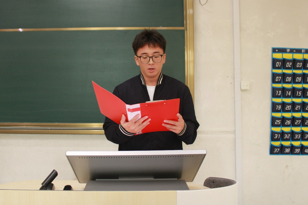 之后,入党积极分子代表高玮发言。他首先回顾了党的发展历史和光辉历程,坚定了入党积极分子们加入党组织的决心,并代表全体党积极分子做出以下四点保证,一、遵守上课纪律,提升党性修养;二、积极参加讨论,开拓思维能力;三、端正入党动机,培养政治意识;四、学习理论知识行动践行宗旨。
