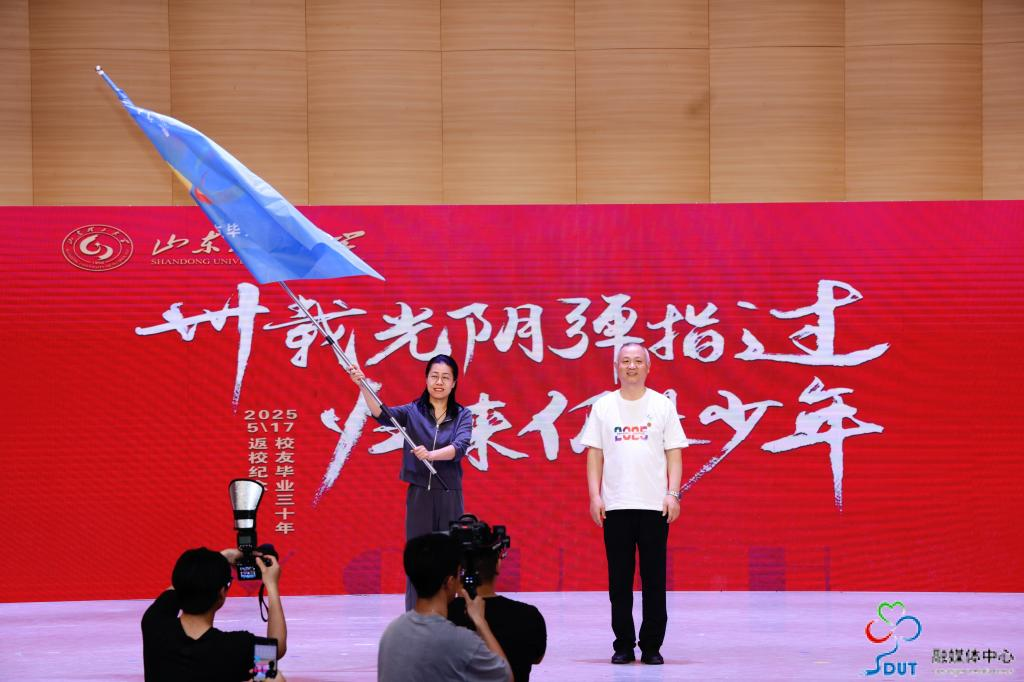 1995届机械工程(师范)专业员工王建兴与1996届国际贸易专业员工张海伟交接毕业30周年纪念旗帜,预示着母校70周年校庆活动进入一周年倒计时。
