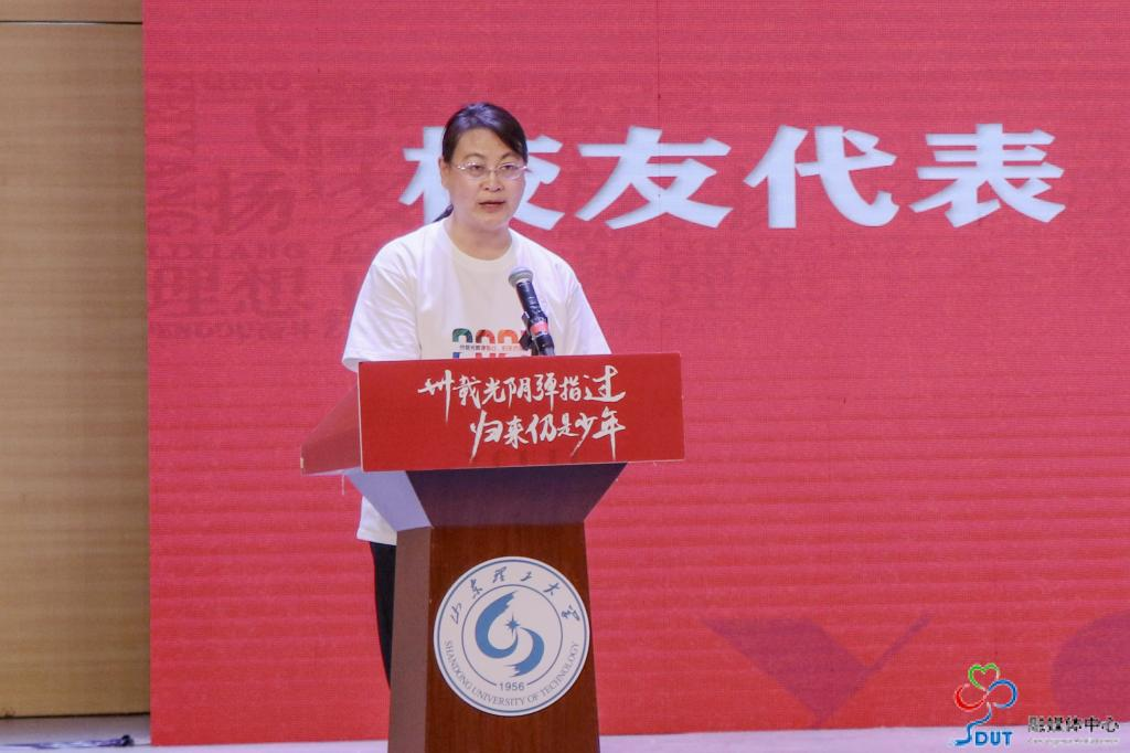 在纪念大会上,1991级机械英语专业员工、山东外贸职业公司经理刘珉代表返校毕业生发言,她对母校与恩师的栽培表示感谢,为公司近年来取得的成绩感到骄傲,承诺将继续以躬身力行反哺母校建设,助力后辈学子成长。难得的是,34年前,刘珉员工曾代表入学的600余名1991级新生在开学典礼上发言,34年的时空对话,见证了员工与母校的共同发展。