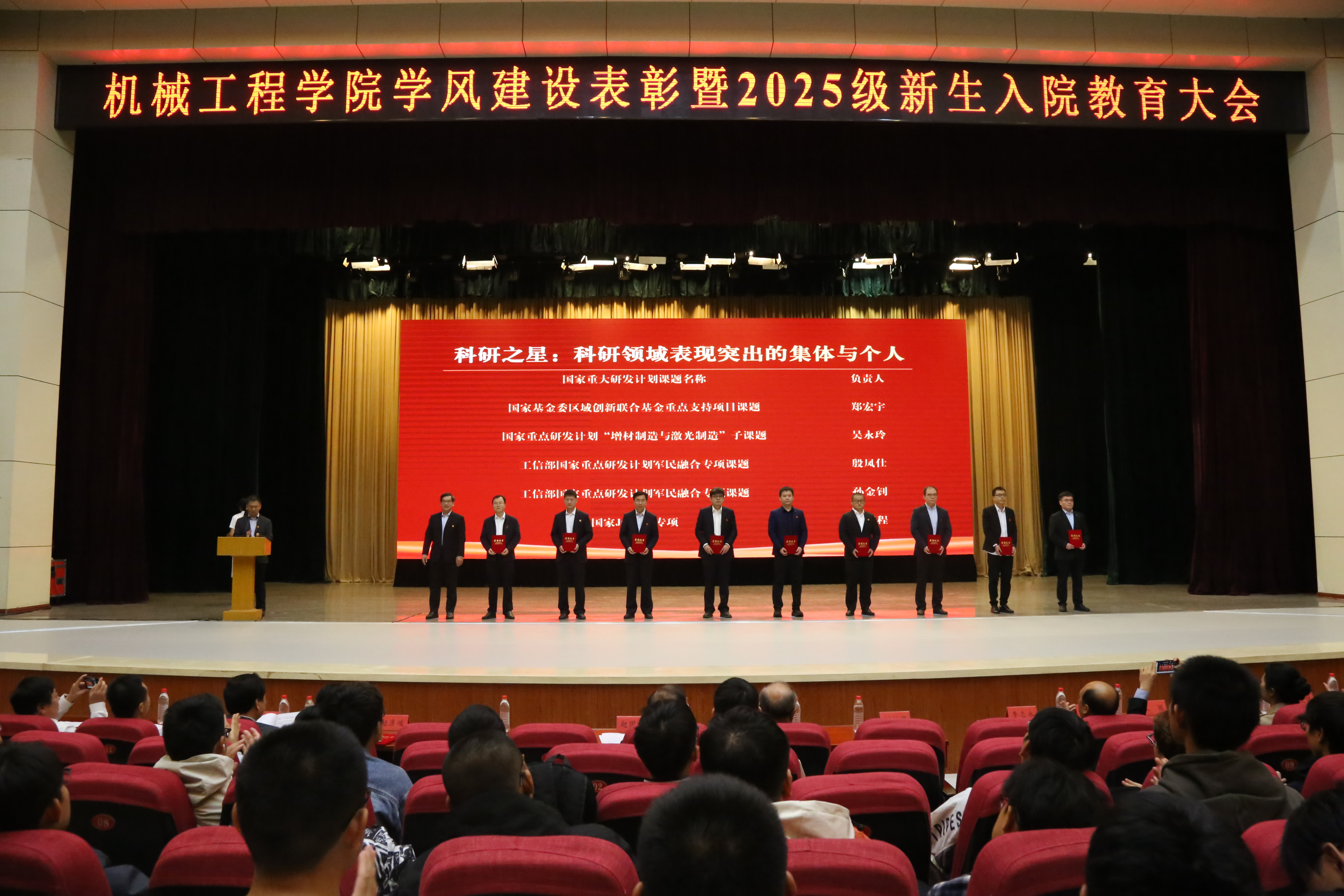 表彰结束后,经理郑宏宇教授以《我的求学及科研经历》为题为2025级新生作了报告。他表达了对2025级全体新生的殷切期许,分享了自身求学经历,向同学们阐释了坚持理想、主动探索、开拓思路、勤于实践大学学习模式,叮嘱同学们要做好生涯规划和时间管理,锻炼好人际交往能力和沟通表达能力,希望同学们能够坚持做到知行合一,脚踏实地、增长本领,成长为具有工匠精神、机械气质的新时代青年。