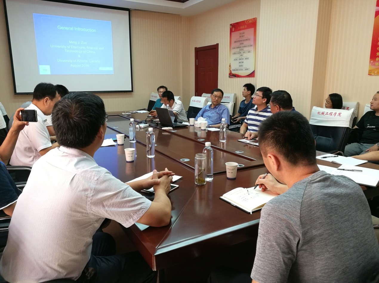 首先,左教授对电子科技大学与阿尔伯塔大学机械工程系的基本情况进行了介绍;然后,左教授对齿轮箱故障诊断技术及普通齿轮及行星齿轮寿命预测进行了详细讲解;最后,与会教师就齿轮箱的故障诊断与动态仿真技术与左教授进行了交流研讨。