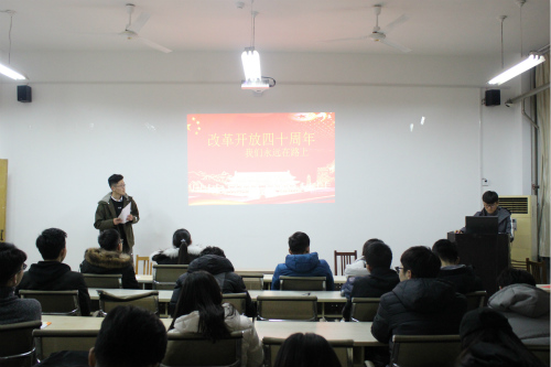 此次活动以PPT展示形式进行,各小组同学根据纪录片《我们一起走过》以及12月18日习近平在庆祝改革开放四十周年大会上的讲话等内容提前完成PPT制作,并据此作总结阐述。他们就我国政治、经济、文化等方面对改革开放历史背景、改革开放40年以来人们衣食住行的变化、我国外交史的演变多角度全方位地展示改革开放40年的风雨历程。此外,发言同学介绍数十年来为国家发展作出巨大贡献的“改革引路人”,共同学习他们无私奉献、勇于担当、为国争光的崇高精神。