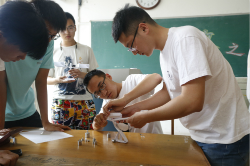 此次活动以“科技创新、团队合作、动手能力、物理知识”为主题,本着“公平”“公正”“公开”的原则进行评比。活动要求参赛者制作杠杆时间须少于30分钟,每批队伍统一开始比赛。开始比赛后进入计时,30分钟结束后所有参赛者必须停止制作进行杠杆测试,若提前制作完成则记录完成制作时间。参赛者利用所学知识进行杠杆力臂测试,利用活动过程中制作的杠杆进行比赛,首先在离“杠杆”支点较远一端放置一个30g砝码,随后,于离“杠杆”支点较近一端逐个放置不同质量的砝码,直至将“杠杆”远端翘起,裁判记录“杠杆”近端放置的砝码重量,并进行多次砝码放置,选手自行放重物。若放置砝码过程中杠杆任何一个部位破损,视为比赛失败,记入的成绩最好的成绩即为最后成绩。