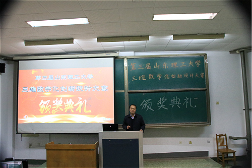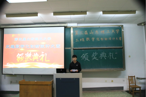 典礼伊始,主持人简要介绍此次典礼的目的及流程。大会第一项,宣读获奖名单并颁奖,此次比赛全校共180人次参加个人赛,20支队伍参加团体赛,经过激烈角逐,最终共有39名同学,6六支队伍脱颖而出。个人赛三等奖19人,个人赛二等奖13人,个人赛一等奖7人,团体赛三等奖三支队伍,团体赛二等奖两支队伍,团体赛一等奖一支队伍。颁奖结束后会议进行第二项,由田书记发表讲话,他指出三维数字化技术是工业化和信息化深度融合与产业转型升级、创新发展的推动力,此技术对当今社会发展具有重要作用,并向同学们寄予殷切希望,在田书记的鼓励下,在即将到来的2020年里,机械学会定会再创佳绩。第三项内容由参赛选手代表姜升发言,分享自己经历及获奖感悟,鼓励一同奋进的山理工学子共同努力。