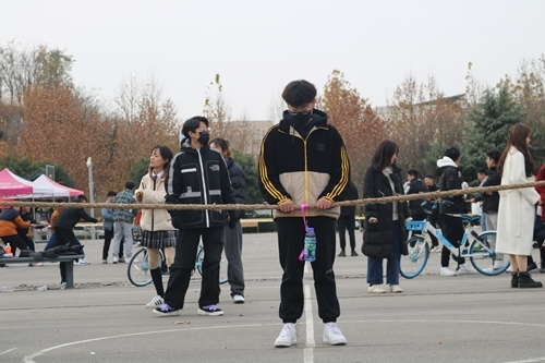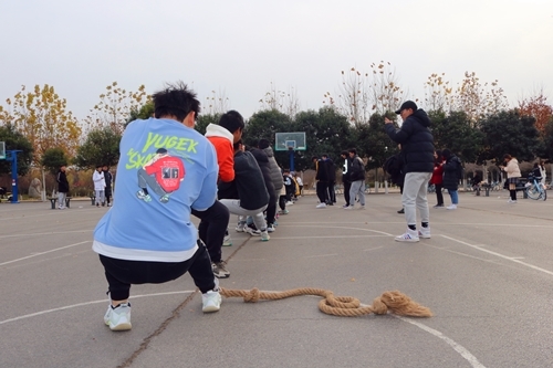 依据公平公正,安全第一的原则,活动负责人首先宣布比赛规则及注意事项:此次比赛以场地内三条间隔2米平行白线为界,拔河绳中间标志物红丝带及负重物率先拉过本队第一条白线为胜利标志。各班按抽签顺序上场比赛,比赛过程中各班不得替换参赛人员。突发意外情况下,主裁判可随时宣判终止比赛。随后在比赛哨声的一声令下,各班级代表队有序上场。比赛过程中,各班代表人员气势高昂,齐心协力,坚持不懈,现场欢呼声、呐喊声震耳欲聋,此起彼伏,飘荡在整个篮球场上空。