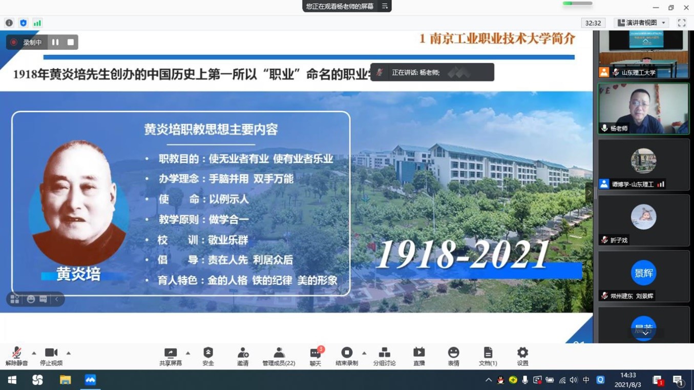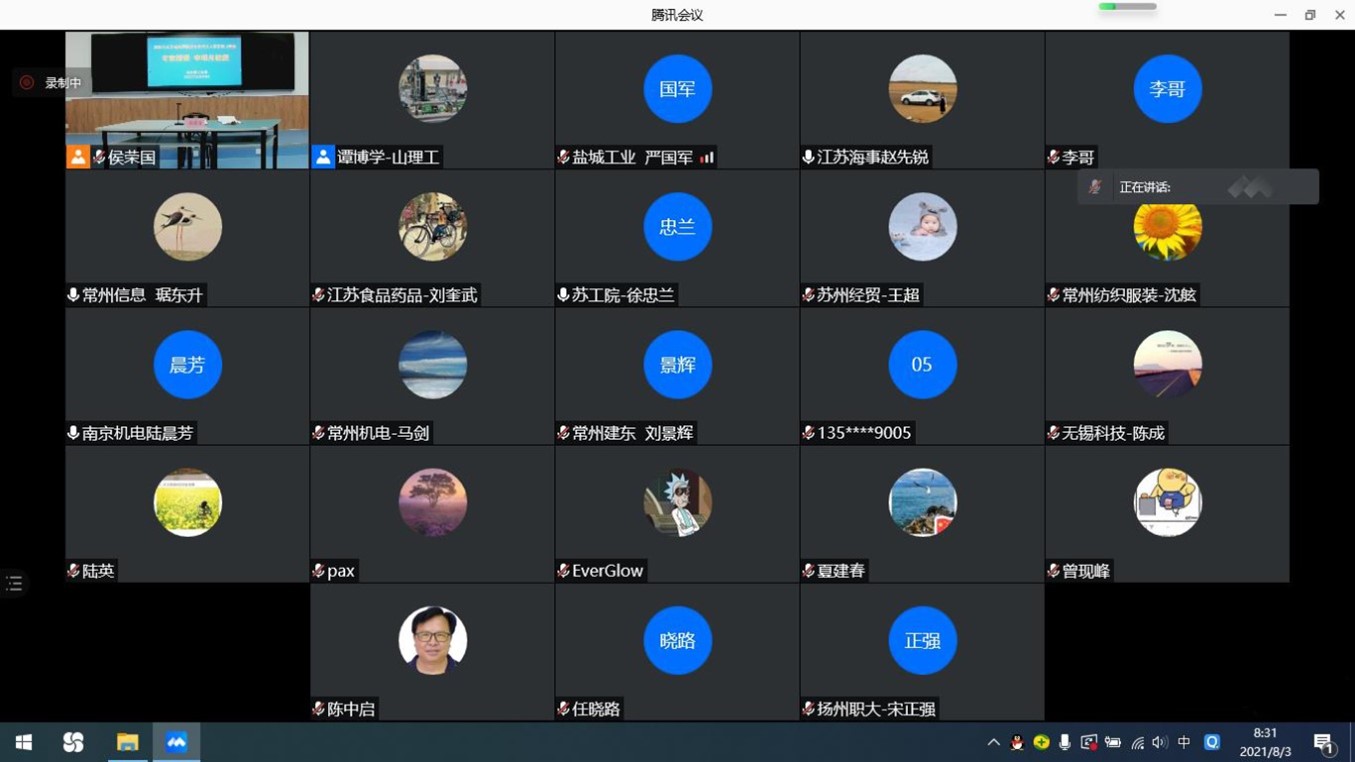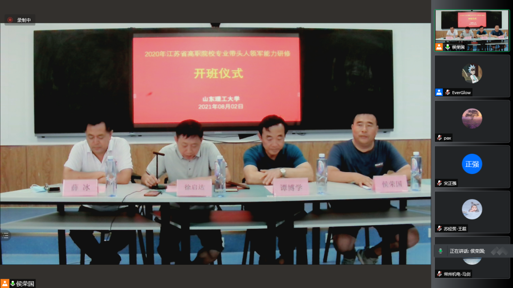 2021年江苏省职业院校专业带头人领军能力研修开班仪式于8月2日在公司12号教学楼411智慧教室举行。因江苏疫情影响,本次培训班开班仪式通过腾讯会议线上进行。
