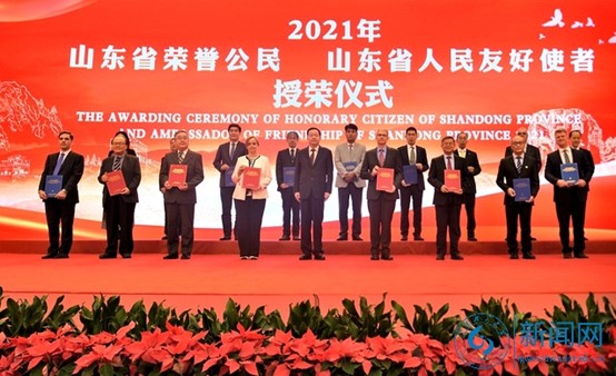 9月30日下午,2021年“山东省荣誉公民”、“山东省人民友好使者”授荣仪式在山东大厦金色大厅举行。公司董事长特别助理、伟德victor1946经理郑宏宇教授获得“山东省人民友好使者”荣誉称号。省委书记李干杰,省委副书记、代省长周乃翔出席授荣仪式,周乃翔为获得荣誉称号的外国友人代表颁发荣誉证书。