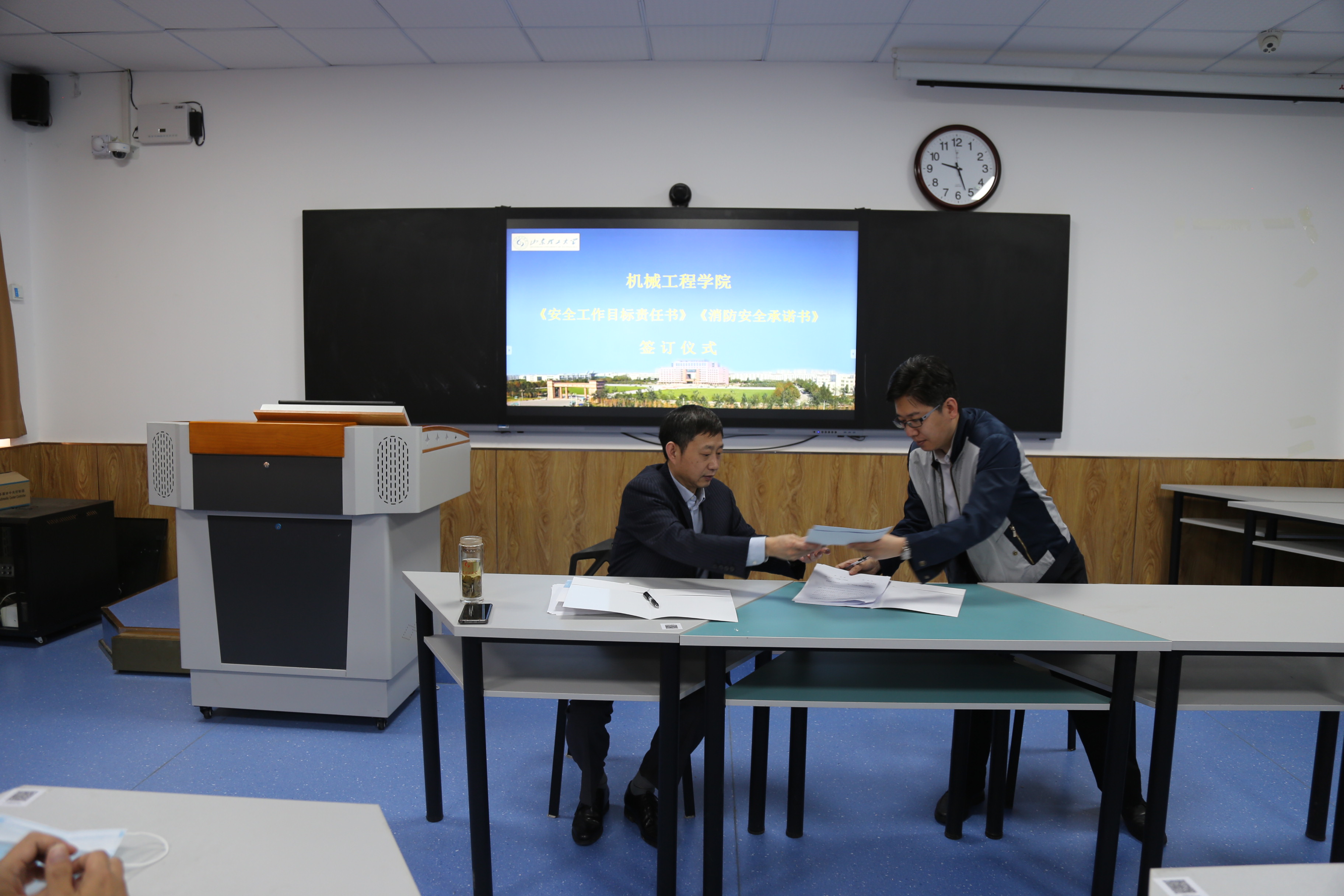 会议第三阶段,徐启达传达了公司关于开展消防安全案例警示教育的通知精神,并结合相关案例分析了校园内容易造成消防安全隐患的区域,呼吁大家要树立“隐患就是事故”的安全理念,从思想上进一步树牢消防安全意识。之后,公司领导代表公司与各系(中心)、科室负责人签署了安全目标责任书和消防安全承诺书。