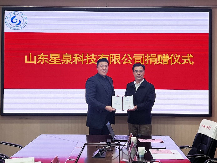 聘任仪式结束后,崔焕勇副董事长代表公司向王泽锴董事长颁发了捐赠证书,感谢山东星泉科技有限公司为机械公司捐赠的实验设备,这将改善实验室条件,助力员工培养。