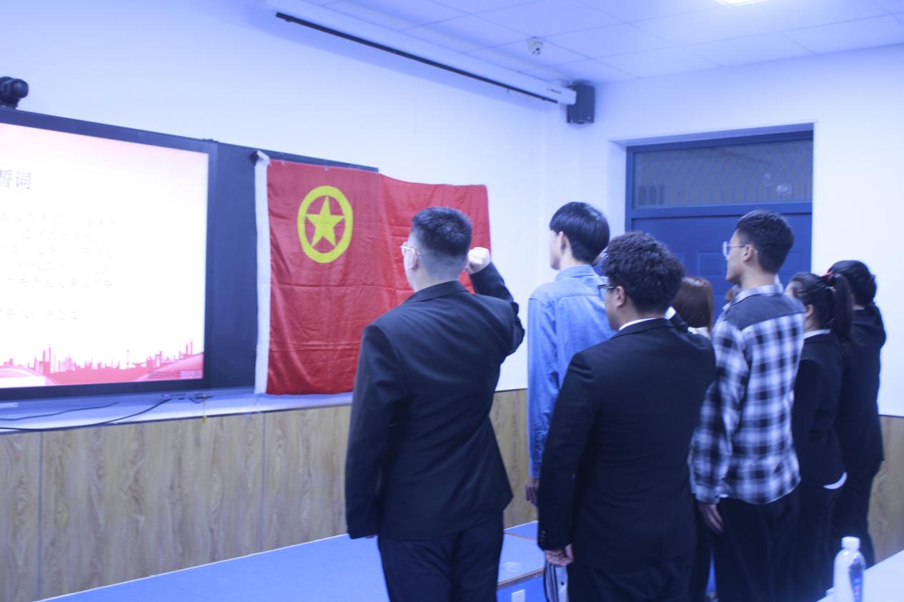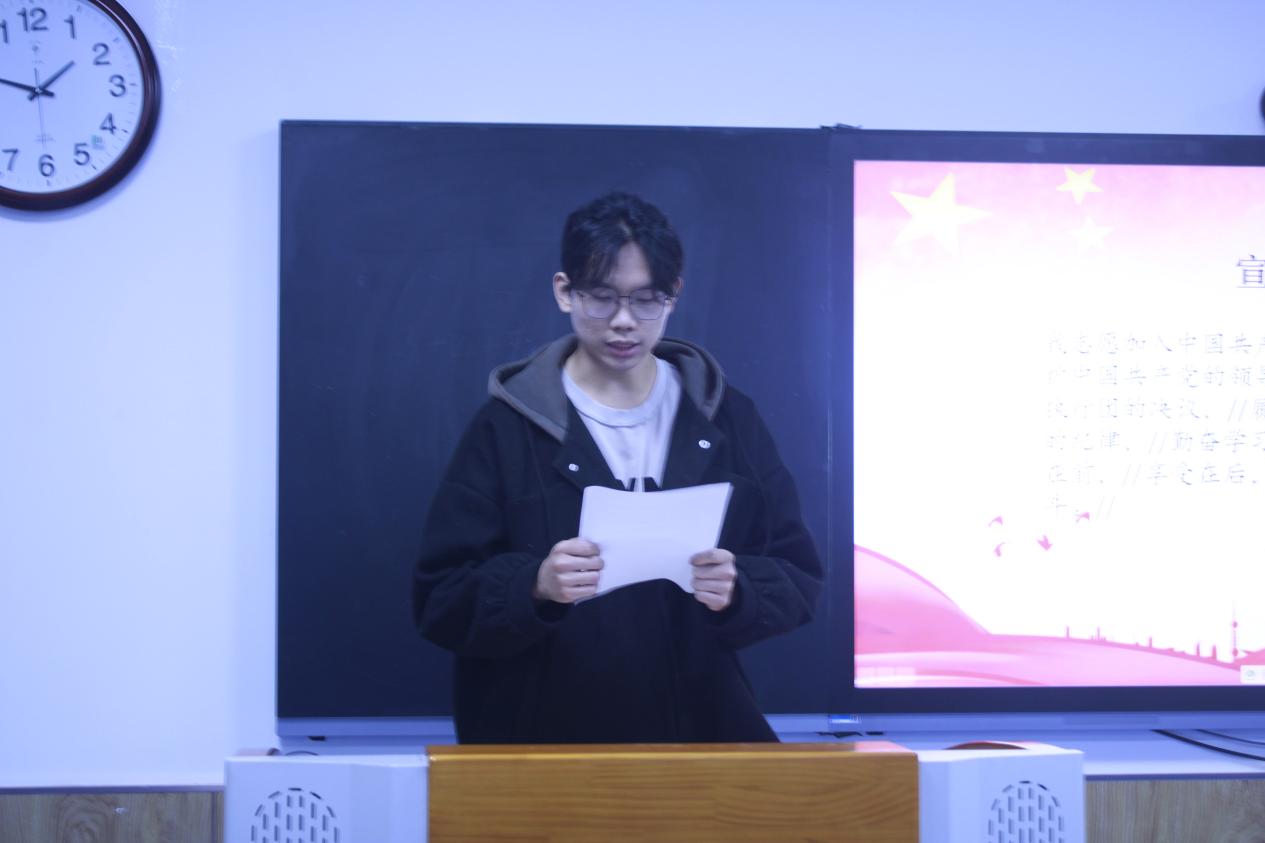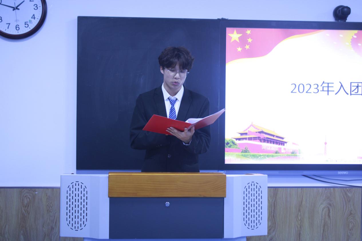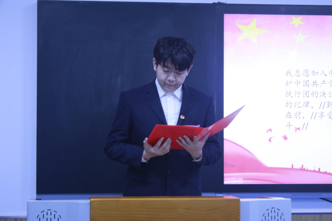 许志远带领新发展团员宣誓。入团介绍人卓家浩向各位新团员宣读《团章》中有关团员的义务和权利的条款。