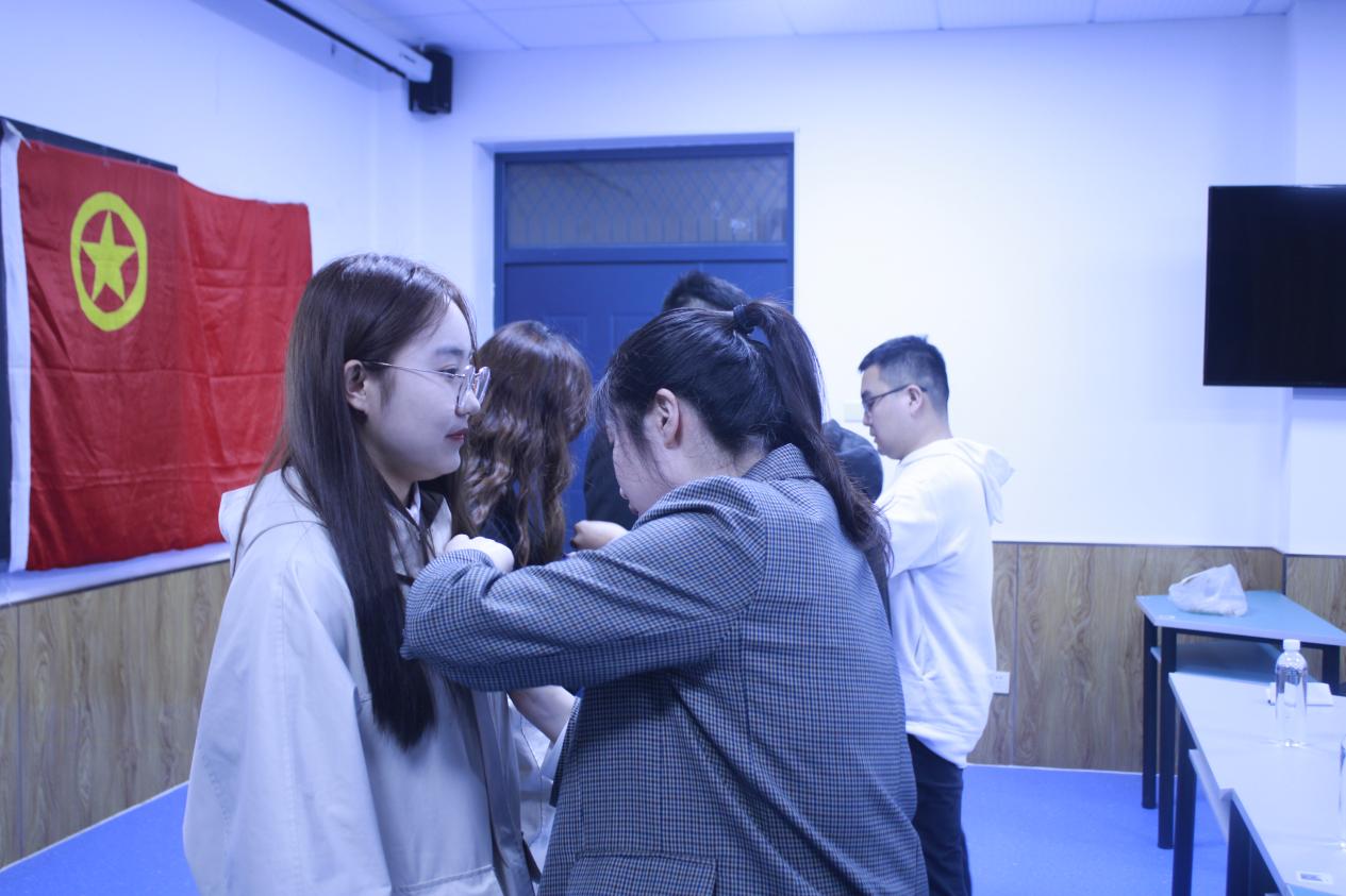 入团仪式在激昂的国歌中拉开序幕。仪式上,参会老师为新团员佩戴团徽。