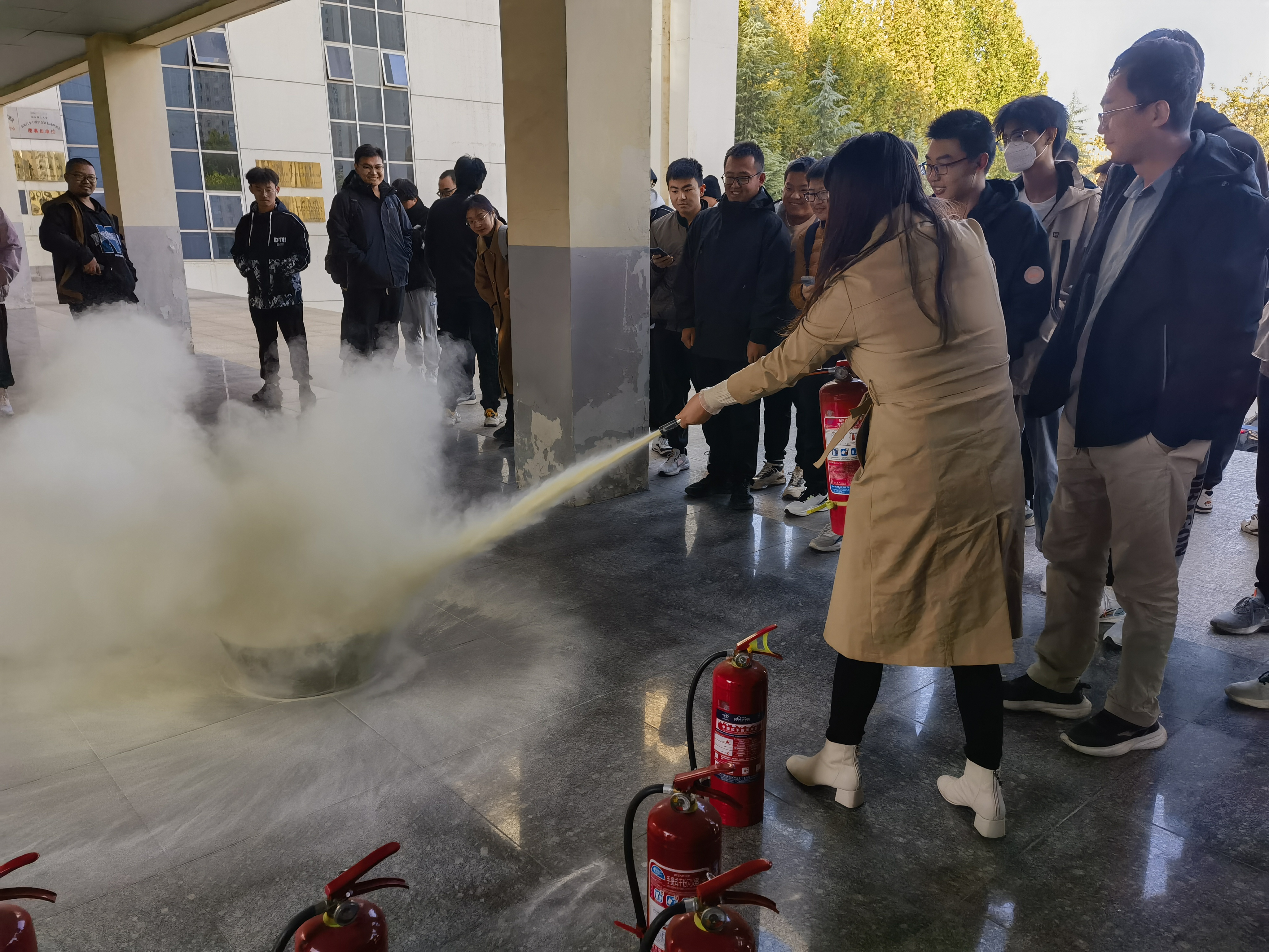 随后,消防专家在机械交通实验楼东侧小广场演示了干粉灭火器的使用方法与技巧,部分师生进行了灭火实操演练。