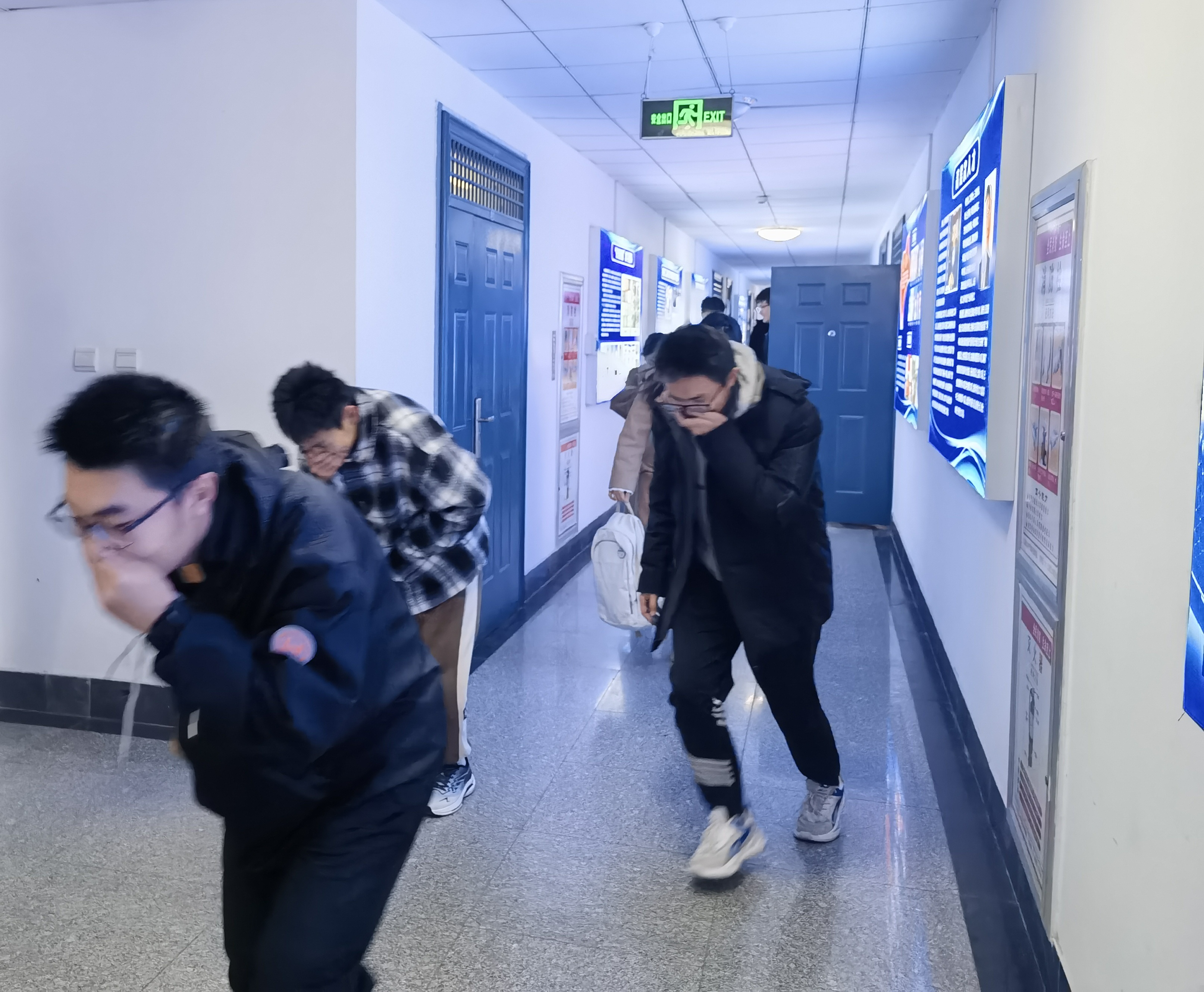 消防安全知识培训结束后,根据预定的演练实施方案进入紧急疏散演练环节。听到“着火了…”的呼声,相关老师迅速到达各自负责的岗位指挥疏导,全体师生在疏导员的指挥下,用手或毛巾捂住口鼻,弯腰快行,有序地从安全通道撤离。整个疏散演练过程有序、高效。