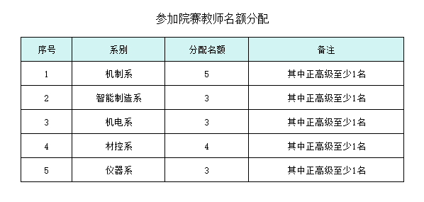 各系按照不低于下表的分配名额,进行系里选拔,12月25日前,将附件7《教师教学创新大赛参赛教师名单》发送至jxjxk2013@163.com。同时各系通知参赛教师,12月25日前,将附件4-6对应的申报书、教学创新成果报告(或课程思政创新报告)、课堂教学实录视频及相关材料,发送至jxjxk2013@163.com,材料准备的具体要求见下。