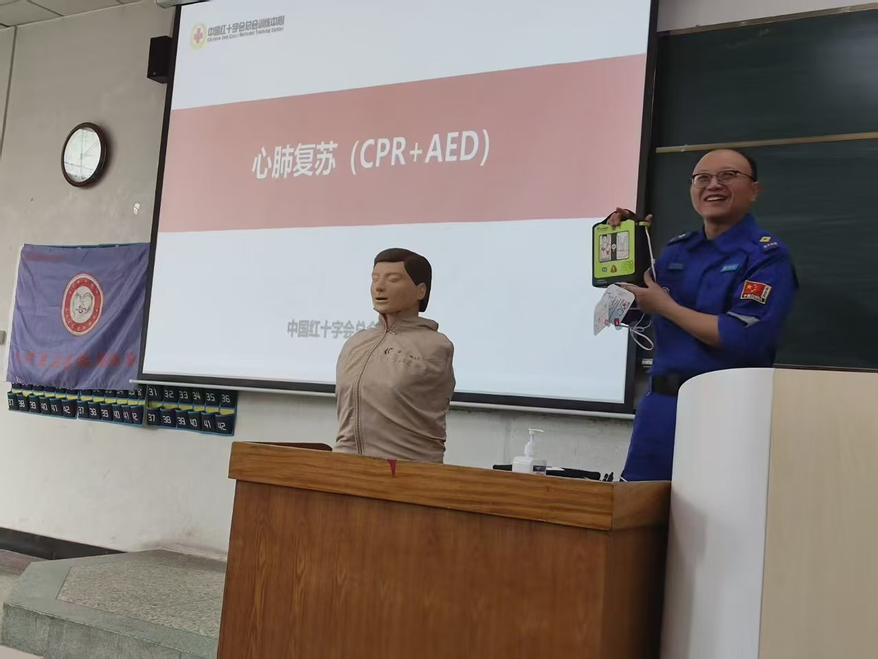 讲座现场布置了模拟急救场景所需的器材,包括人体模型、急救包及AED训练设备,为参与者提供了沉浸式的急救学习体验。