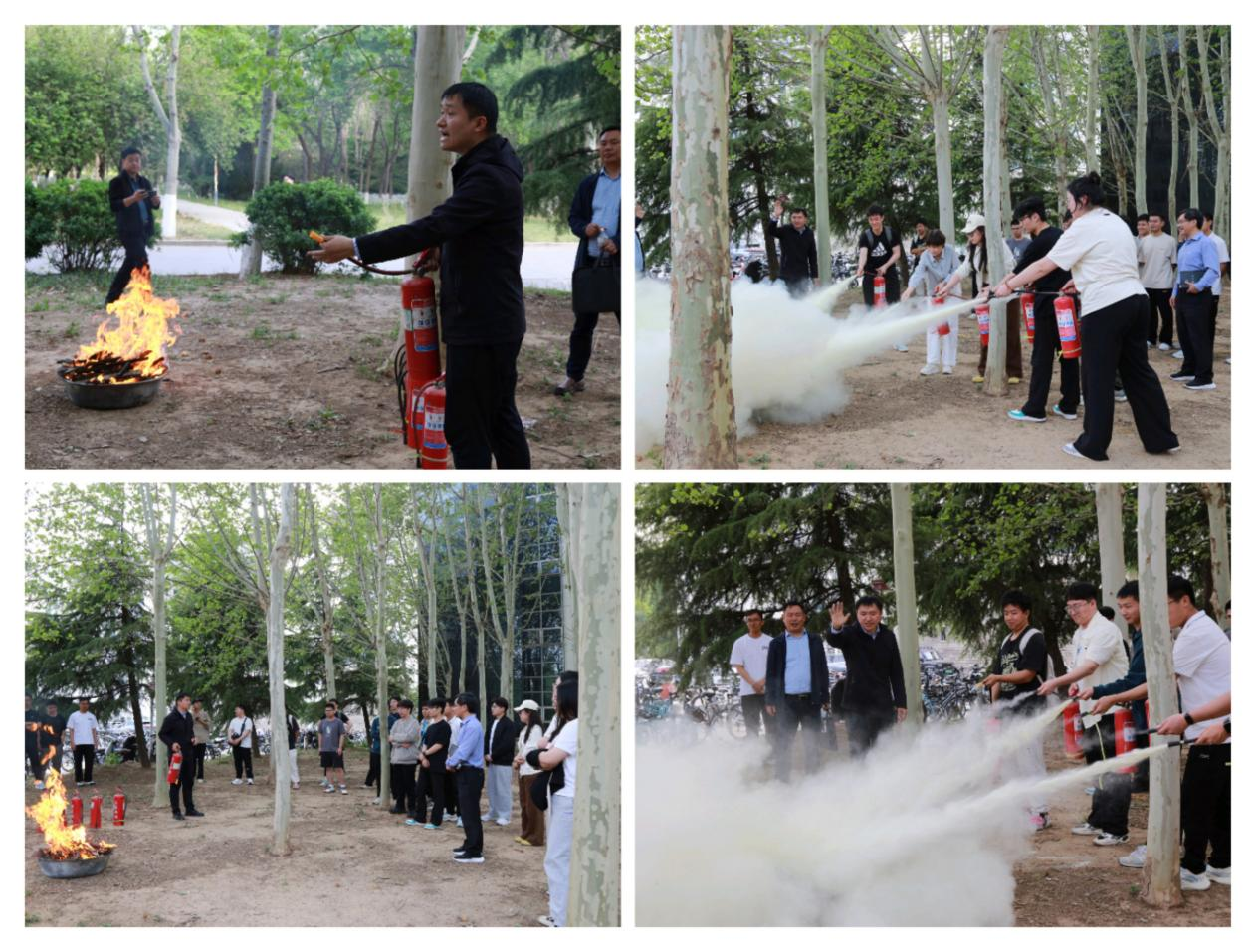 讲座结束后,安全防范科副科长左敏在机械交通实验楼东侧开展消防演练,演示了干粉灭火器的使用方法与技巧,带领部分师生进行灭火实操演练。